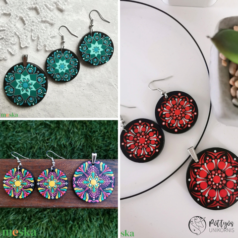 Többféle fa medál + fülbevaló szett - Tarka/Piros/Türkiz választható variációkban