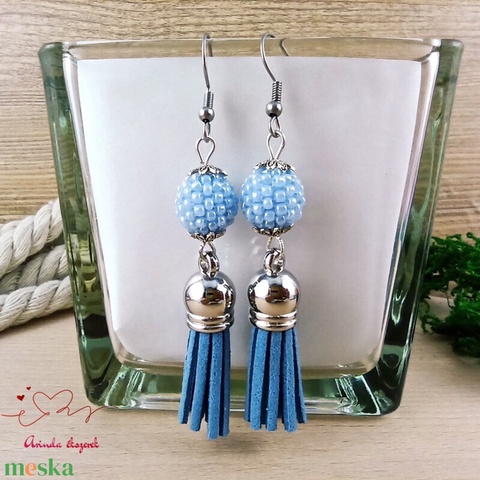 Egyedi bojtos fülbevaló. Könnyű, mutatós, antiallergén, fűzött gyöngybogyóból és velúrbojtból készült.