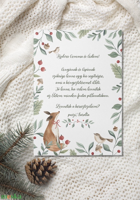 Kedves erdei állatokkal illusztrált keresztszülő felkérő kártya, mely egy oldalt színesen nyomtatott matt prémium minőségű papírra készül.