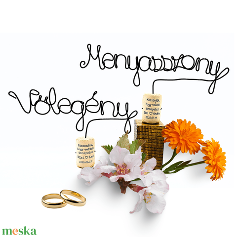 Modern esküvői ültetőtáblák drótból, matricázott parafadugóban - ültetőkártya és köszönőajándék/köszönetajándék egyben