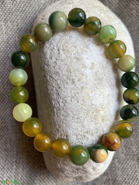 Női karkötő Indián achát 8 mm-es gyöngyökből füztem sárgás zöldes színben v. mély fenyőzöld színben választhatod
