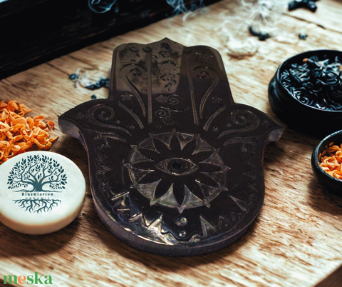 ORGONIT Hamza keze, harmónia füstölő tartót készítettem sungit porral, aventurin, hópehely obszidián, pirit és labradorit ásványokkal, alumíniummal, vassal, sok csillámmal gyantába öntve. A virágban lévő szembe helyezhető a füstölő. A mérete: 13,5 cm magas és 10,4 cm széles.
