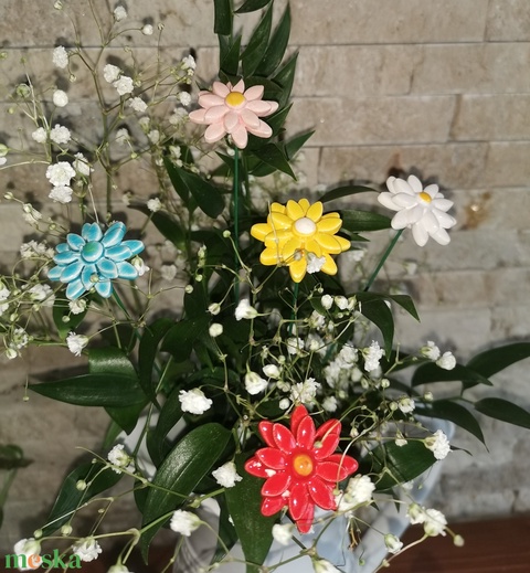 Szedj egy csokrot a virágos kertemből ! Fehér agyagból aprólékos kézi munkával és 2 szeri égetéssel készített mázas kerámia virágok festett drótszáron.Díszítheted vele lakásod,kerted ,balkonod.Átmérője:3 cm .A váza és az élő zöld növény nem a termék része.Boltunkban minden alkotás kész termék ezért akár azonnal megvásárolható ..Személyes átvétel : Bp. XXI.ker .Csepelen lehetséges!