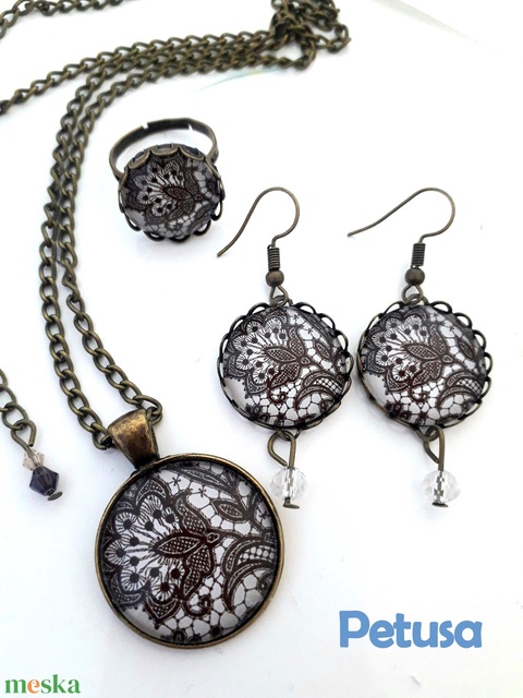 - Anyaga: üveglencse, medál alap, gyöngy, lánc, delfinkapocs, gyűrű, fülbevaló