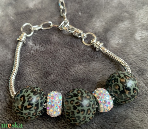 Női karkötő zöld leopárd mintás és strassz köves gyönggyel állítható méretű kapcsos karkötő