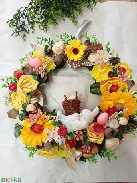 - Anyaga: vesszőalap, virág, buxus, sziv, katicabogár, nyuszika, kosár
