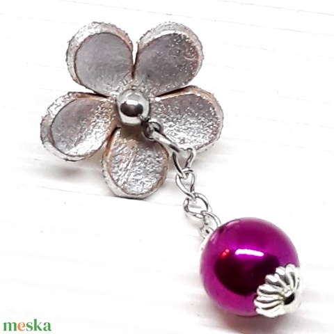 Ezüst virág pink hematit ásvány gyönggyel kitűző, NEMESACÉL, ásványgyöngy ékszer