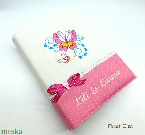 Pillangós hímzett fotóalbum névvel - textil fényképalbum névhímzéssel