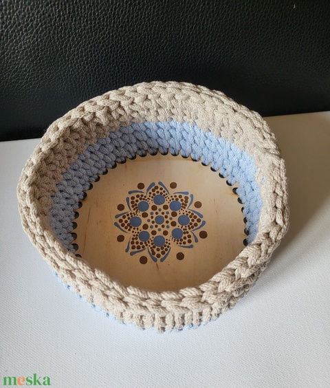 Beige és világoskék horgolt kosár mandala díszítéssel