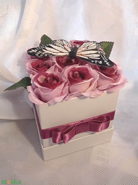 Lepkés rózsadoboz (mályva) virágbox selyemrózsa pillangóval névnap születésnap anyák napja nőnap ballagás
