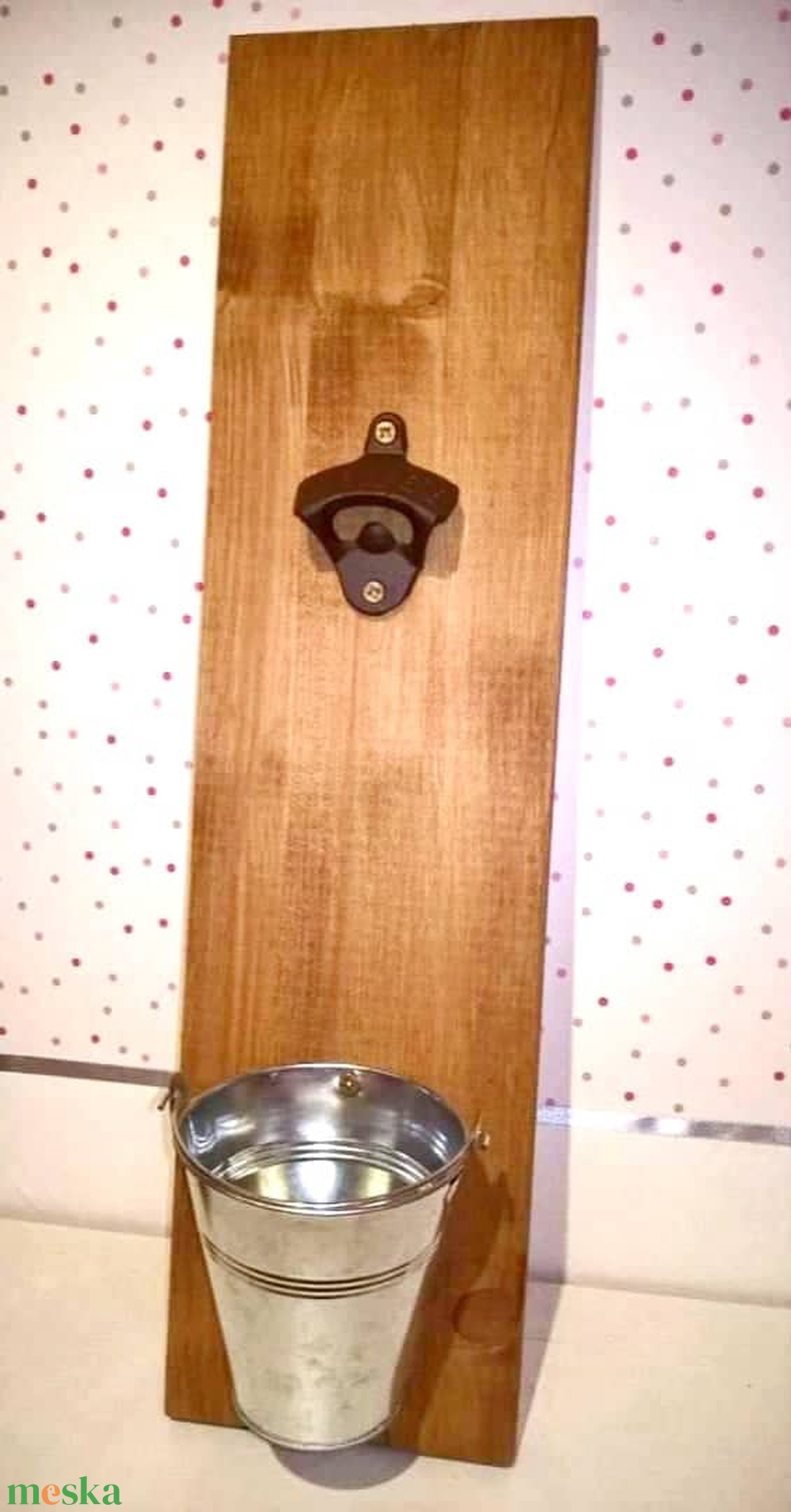 Sörnyitó vödörrel falra szerelhető lazúrozott fa deszkán