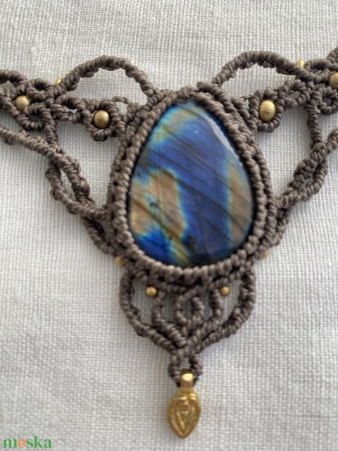 Spektrolit Labradorit makramé medál. Gyógyító kristály makramé medál eredeti holvkővel. Valódi hegyikristály medál