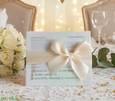 Ha viaszpecsétet is kérsz, vékony szalaggal készül a meghívó, ha nem kérsz pecsétet, vastag szalaggal masnizom. Fehér, ekrü vagy arany színekből tudsz választani alap esetben, de ha van egyedi kérésed, egyeztessünk.