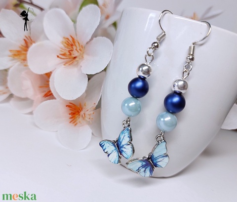 Tűzzománc pillangós fülbevaló világos és sötétkék swarovski gyönggyel