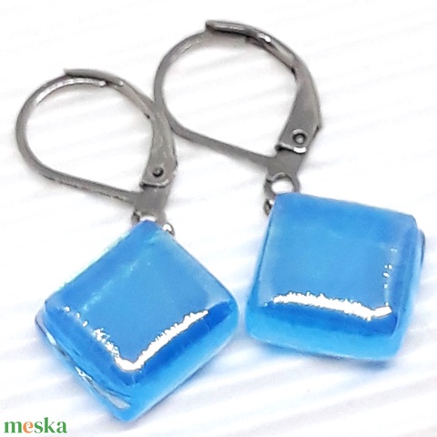 NEMESACÉL - Égszínkék tükörfény rombusz francia kapcsos üveg fülbevaló, üvegékszer