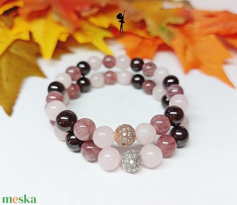 A karkötők egyformák csak a cirkónia gömb színe más. 8 mm nagyságú gránátból, lepidolitból és rózsakvarcból fűztem, gumis damilra.