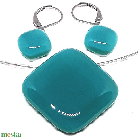 NEMESACÉL - Hamvas smaragd üveg rombusz medál és francia kapcsos fülbevaló, üvegékszer szett