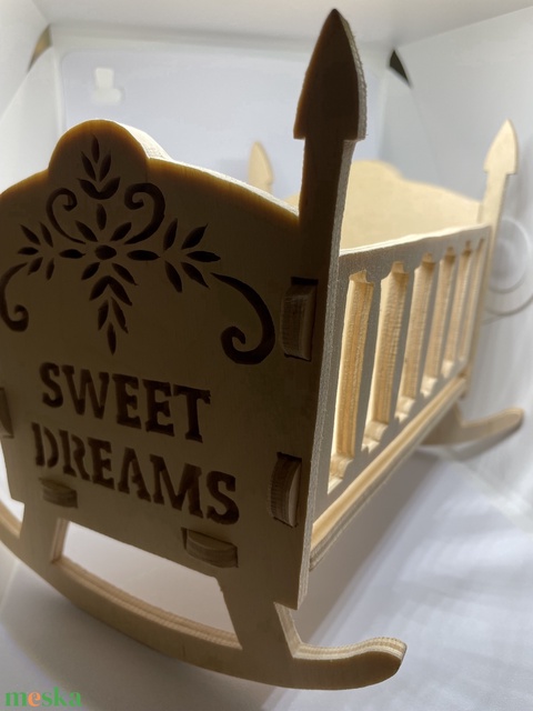 6 mm rétegelt lemezből készült baba játék bölcső. Natúr kezeletlen rétegelt lemez a termék anyaga. 3 éves kor alattiaknak nem ajánlott. Igény esetén magyar felirattal is kérhető aminek az elkészítési ideje 7 munkanap