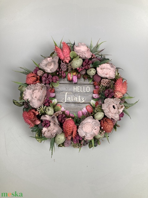 Mohaágyon fekvő fakorongos "Hello Tavasz" feliratú tavaszi terméskopogtató