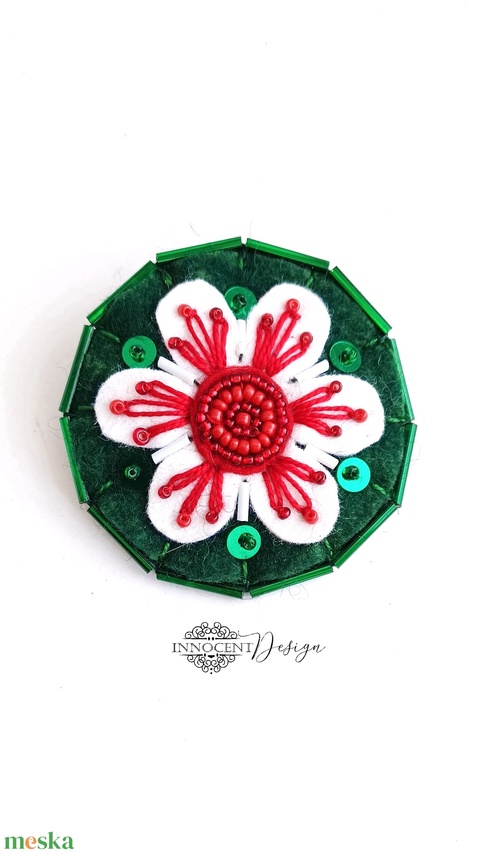 - Anyaga: gyapjúfilc, cérna, gyöngy, flitter, kitűzőalap