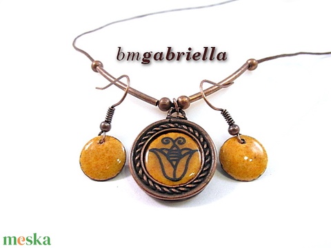 Egyedi tűzzománc ékszerszett - kézműves fülbevaló és nyaklánc - magyar népi motívum - okker tulipános