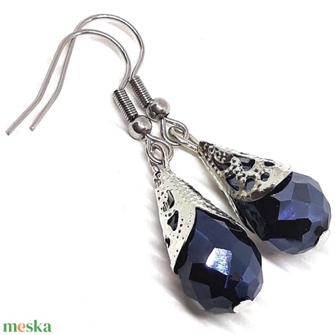 NEMESACÉL - Sötétkék metál fényű üveg csepp gyöngy fülbevaló, üveggyöngy