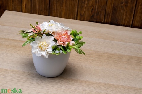 Selyemvirág asztaldísz - Fehér-Barack-Zöld színvilág, fehér kaspóban