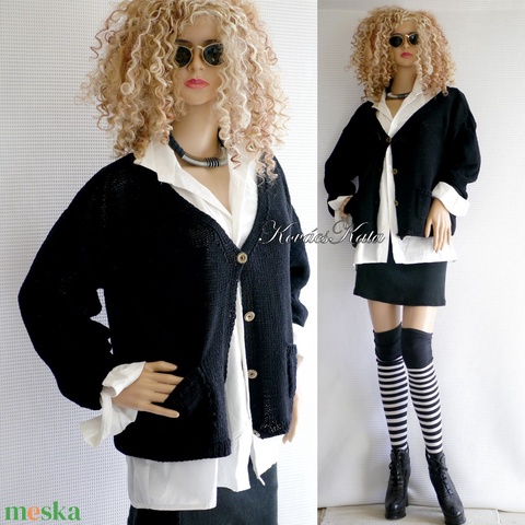 DONA-STAR - exkluzív kézzel kötött extra-finom merinó kardigán, pulóver / fekete KÉSZLETEN