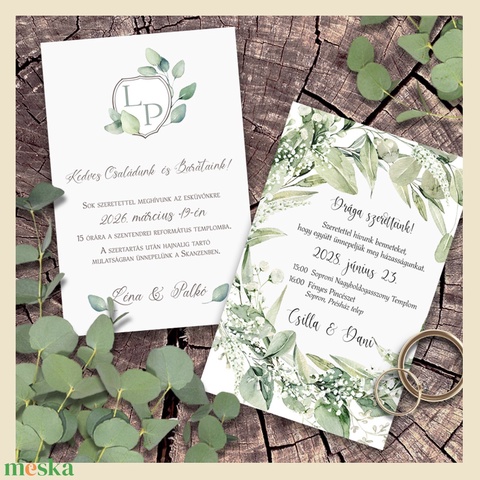Az örök klasszikus: a greenery esküvői meghívó. Akvarellel festett, csodás zöld árnyalatok, sokféle elrendezésben.