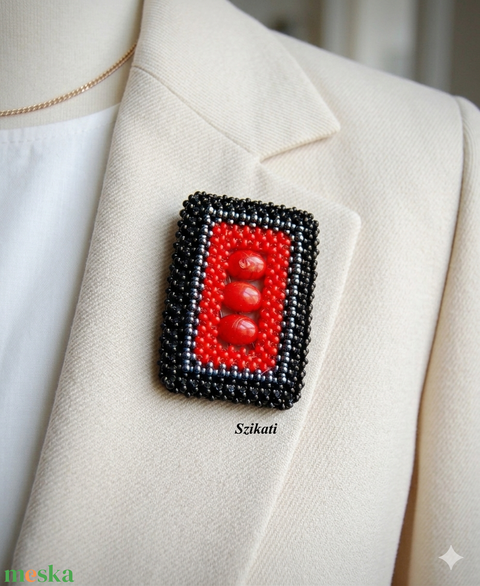 Piros - fekete gyöngyfűzött kitűző