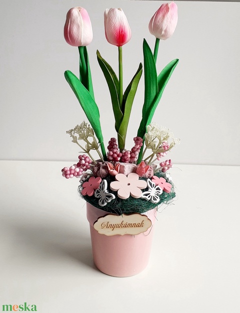 - Anyaga: kaspó, gumi tulipán, virág díszek, fa figurák, szalag, felirat
