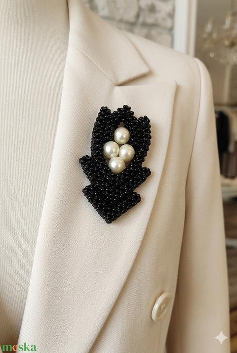 Fekete - gyöngyház gyöngyfűzött kitűző