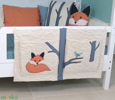 Erdei hangulat gyerekfalvédő, zsebes tároló, róka, madár, fa mintákkal, névnapra, névre szóló ajándék gyermeknek