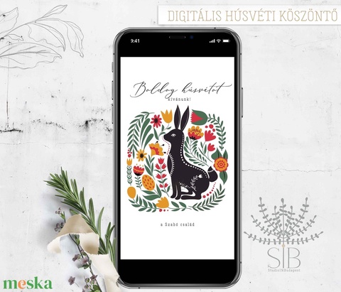 Húsvéti köszöntő népi motívumokkal, nyuszis digitális képeslap, letölthető húsvéti üdvözlő
