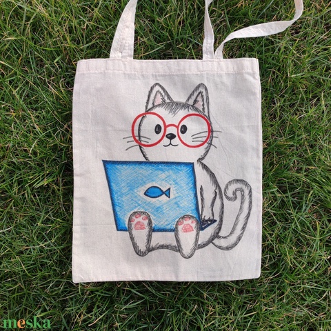 home office cica ~ kézzel rajzolt natúr vászontáska