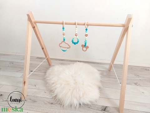 - Anyaga: szilikongyöngy, szatén zsinór, fa karika, fa gyöngy, fa léc, fa figurák