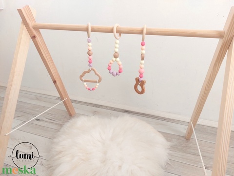 - Anyaga: szilikongyöngy, szatén zsinór, fa karika, fa gyöngy, fa léc, fa figurák