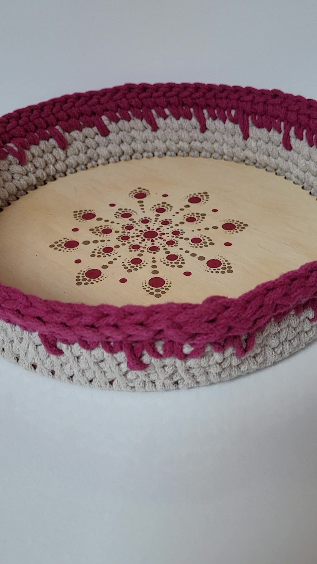 Bordó és beige horgolt kosár mandala díszítéssel, Húsvétra tojás- , csokigyűjtéshez