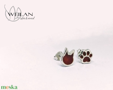 Karnevál - Cicafej és cicatalp aszimmetrikus ezüst tűzzománc fülbevaló, bedugós "pöttyfülbevaló" sötétvörös