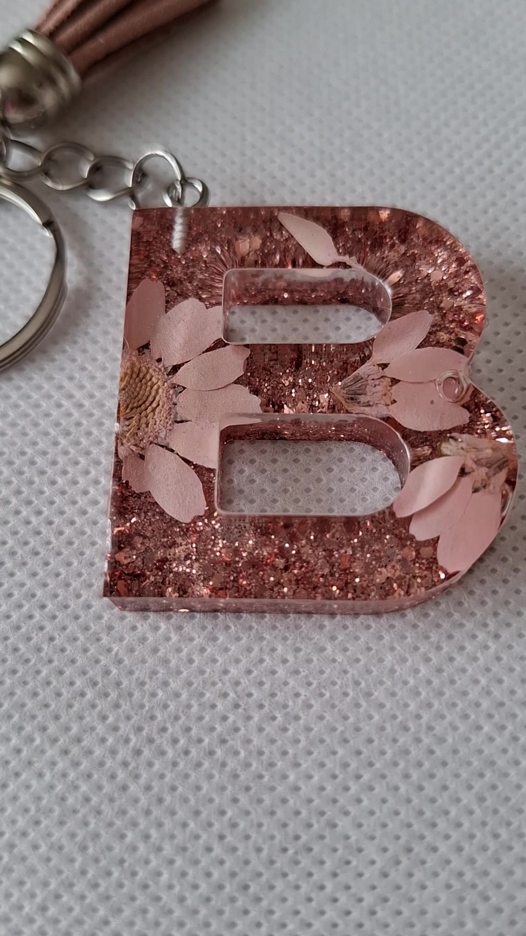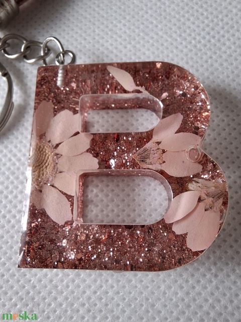 Rózsaarany, betűs kulcstartó valódi virágokkal