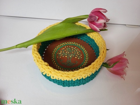 Sárga, zöld horgolt kosár életfa mandala díszítéssel, Húsvétra tojás- , csokigyűjtéshez
