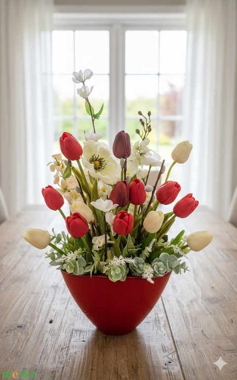 Tulipános asztaldísz piros fehér