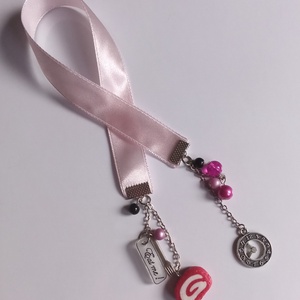 - Anyaga: szaténszalag, üveggyöngy, szerelékek, szalagzáróvég, ezüst színű függők, süthető gyurma