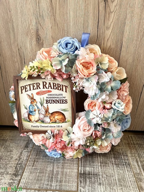Extra nagy méretű Nyúl Péter ajtódísz művirággal, fa táblával