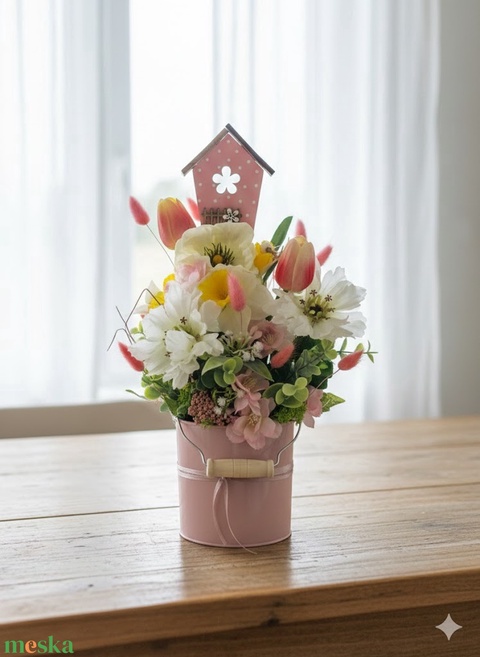 Tavaszi asztaldísz virágos összeállítással – kb. 28 cm