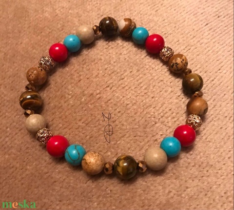 - Anyaga: tigrisszem, türkinit, festett jade golyós piros, képjáspis, arany gyöngy