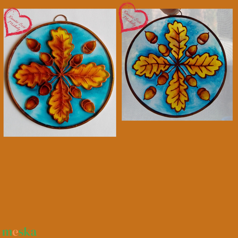 Őszi tölgyfalevél-makkal-/Mini üvegkép/10 cm
