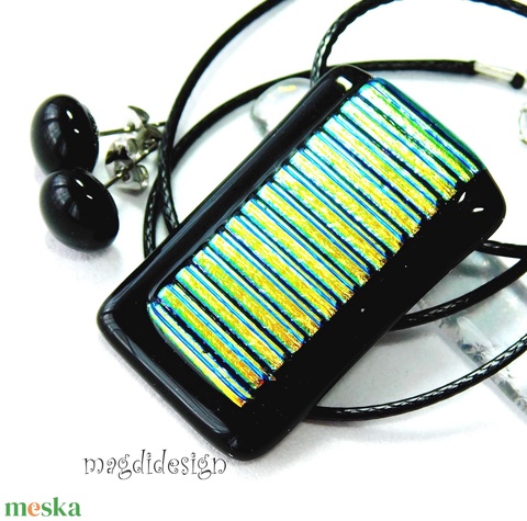 MAXI Fekete-arany csíkos, dichroic üvegékszer szett, nyaklánc, stiftes fülbevaló