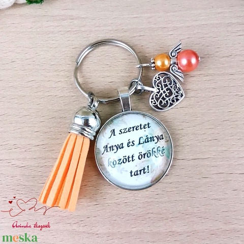 A szeretet anya és lánya között örökké tart narancs bojtos üveglencsés kulcstartó táskadísz