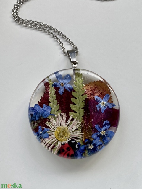 - Anyaga: epoxi gyanta, nefelejcs, katica, páfrány, százszorszép, vadszilva levél